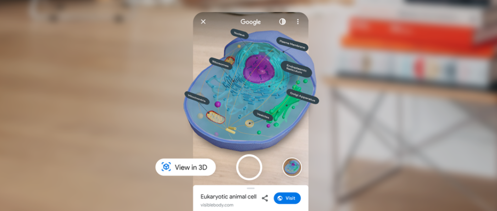 Your search results can have an option for “view in 3D”. Click the button and your Chrome browser will pop open a live camera view in which it will place a 3D object such as a cell: