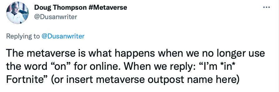 By the time the Metaverse is actually here, we won't even need the name. We'll just be "in" the space which is online: