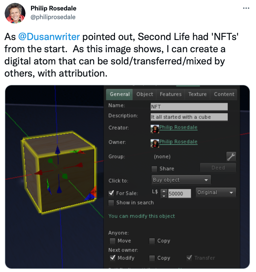 This idea: that NFTs represent creative primitives, is comparable to the 'prims' of Second Life: