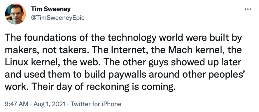 And I personally believe Tim when he says that we all benefit from a Metaverse that is open (which has has said many times). That it can't be owned by any one person.