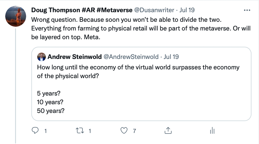I've tried to write about this before. And I realizes it falls on deaf ears. But I still see no reason why we can't at least partly equate, for example, driving a Tesla (or Tesla driving us) as being an experience of the Metaverse. Your car, afterall, will soon become a physical, metal avatar moving through a digital space.