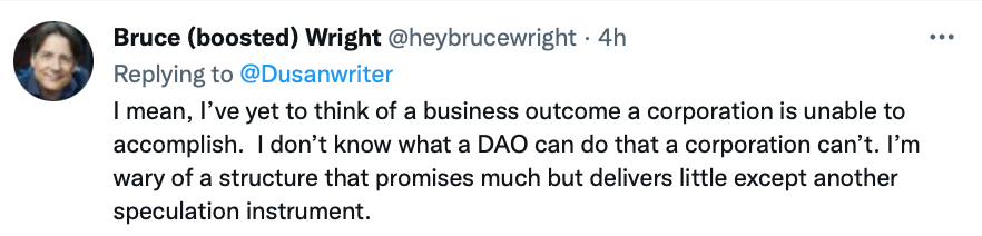 I had an interesting chat on Twitter about decentralized autonomous organizations (DAOs). And it sort of concluded with this:
